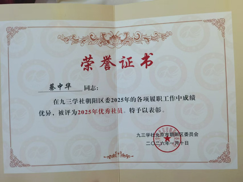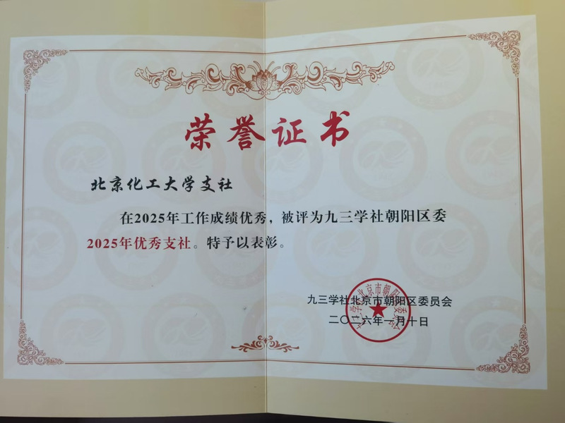 1月10日,九三学社朝阳区委年终总结大会圆满召开,北京化工大学支社获评朝阳区委“2025年优秀支社”荣誉称号。
